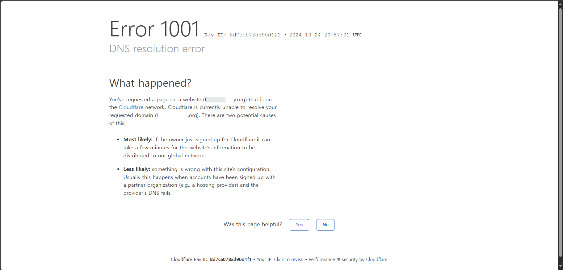 도메인을 새 계정에 연결한 직후에는 2~3시간 정도 도메인에 접속 시 사이트 에러가 발생합니다.