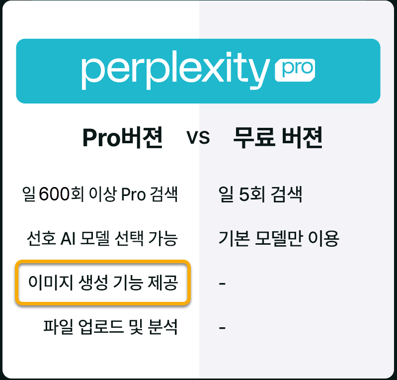 퍼플렉시티는 무료 버전과 프로 버전이 있으면 프로 버전에서는 이미지 생성 기능이 제공되고 파일 업로드 및 분석이 가능합니다.