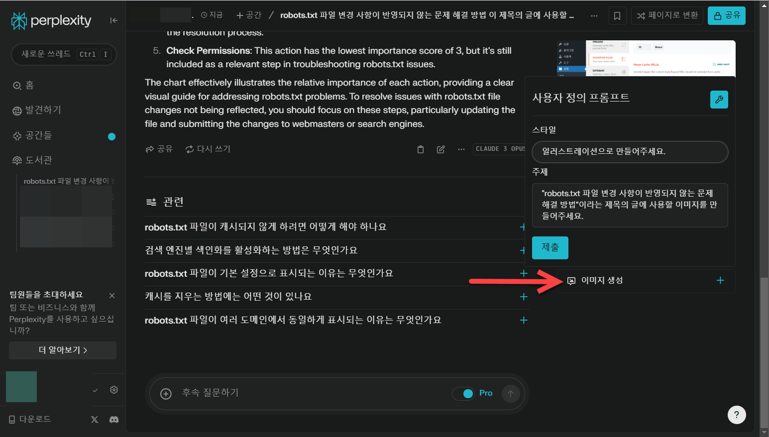 먼저는 Perplexity에 질문을 한 후에 답변을 받은 다음, 오른쪽 하단의 이미지 생성을 클릭하여 이미지를 생성할 수 있습니다.
