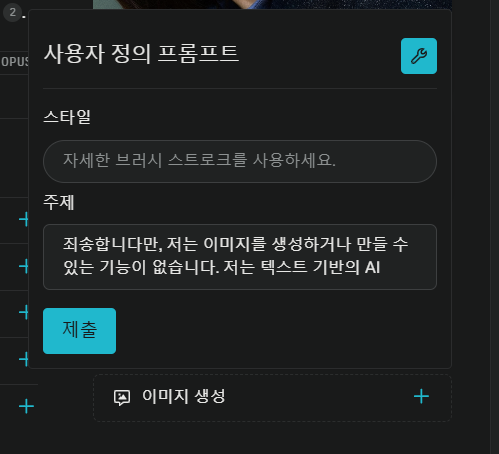 여기에서 스타일을 선택을 하면 내가 원하는 이미지를 생성하지 않는 것 같습니다. 저는 스타일 선택 오른쪽에 있는 아이콘을 클릭하여 사용자 정의 프롬프트 화면을 표시하여 프롬프트를 지정합니다.