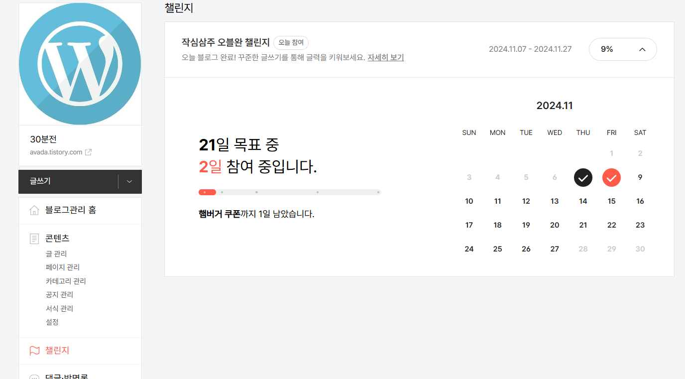 티스토리에서 11월 7일부터 27일까지 3주 동안 오블완이라는 재미있는 챌린지를 진행하고 있습니다.