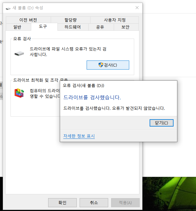 디스크 검사를 해보니 디스크에 오류가 없는 것으로 표시되네요. 아마 CCleaner를 사용하여 레지스트리 정리를 하는 과정에서 에러가 발생한 것이 아닌가 의심이 되네요.