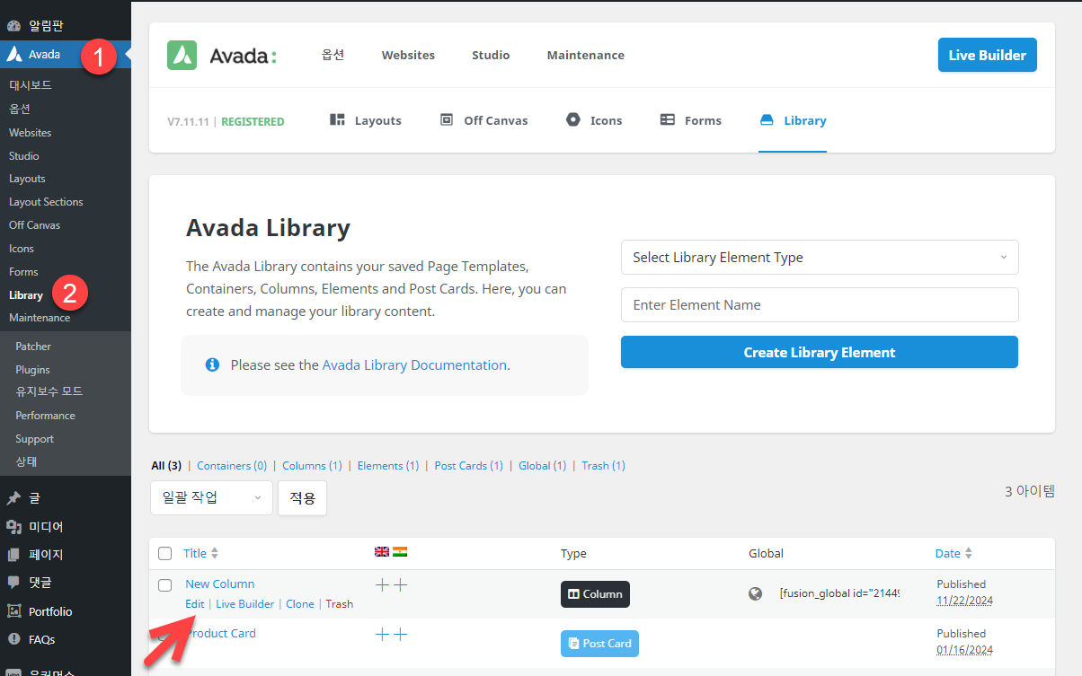 라이브러리 템플릿을 수정하려는 경우 Avada » Library로 이동하여 해당 라이브러리 위에 마우스를 올려 Edit (편집)을 클릭합니다.
