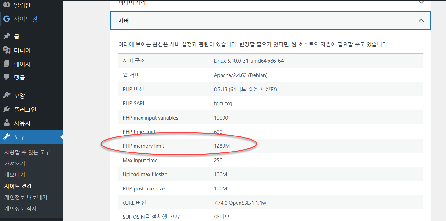 메모리 크기는 도구 » 사이트 건강 » 정보 탭 » 서버 섹션에서 확인할 수 있습니다.
