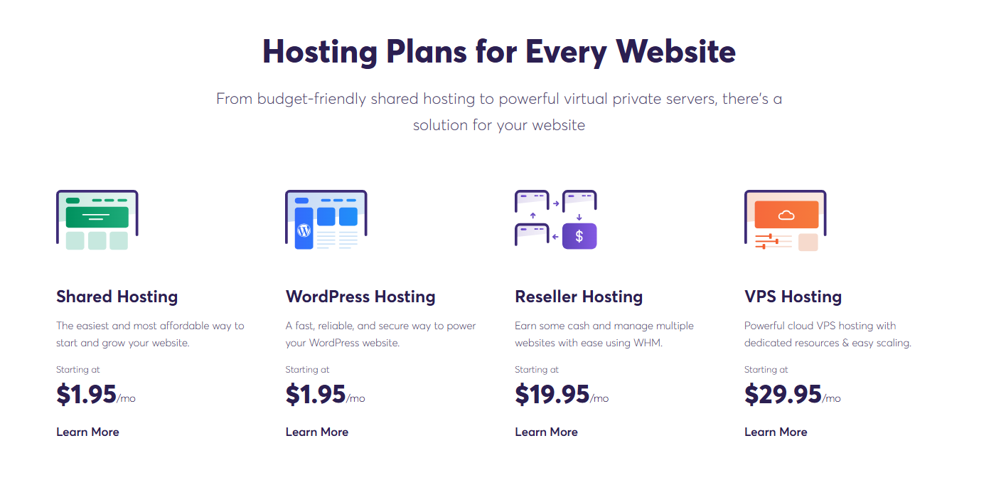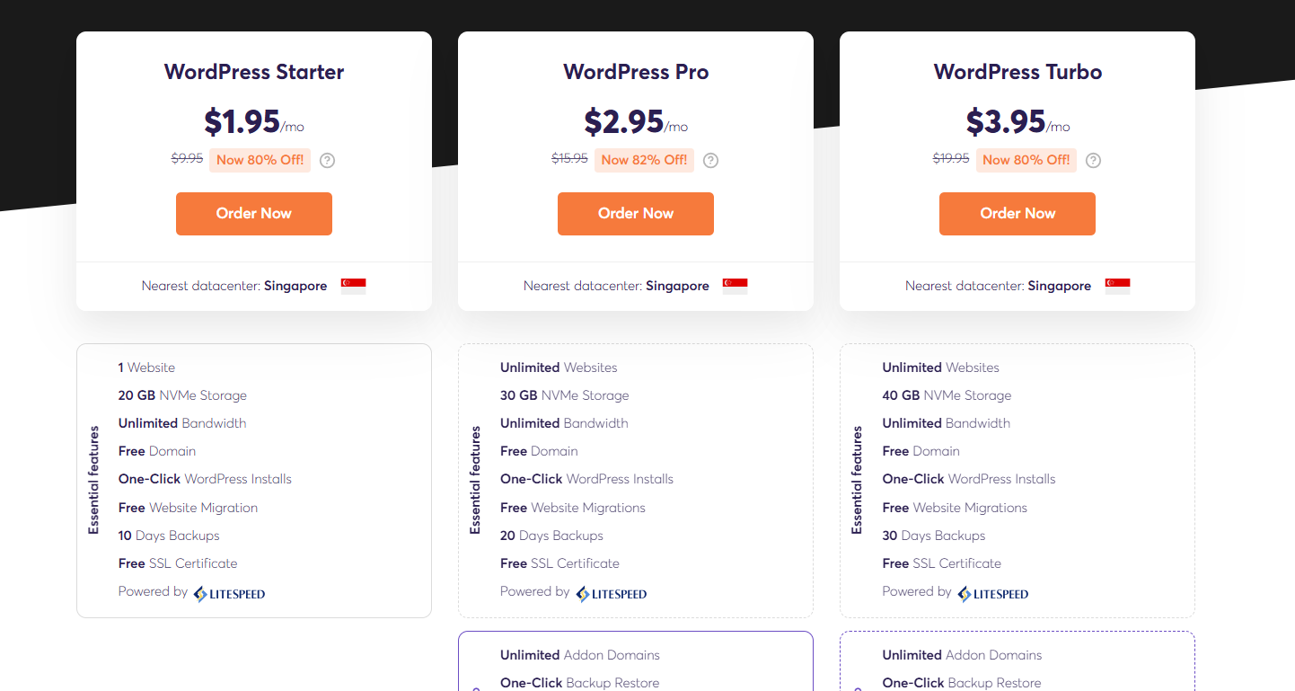 워드프레스 호스팅에는 WordPress Starter, WordPress Pro, WordPress Turbo 플랜이 있습니다. 최저가 상품인 WordPress Starter의 경우 1개의 사이트 운영에 적합하고, 2개 이상의 사이트를 운영하려면 WordPress Pro 이상을 선택해야 합니다.