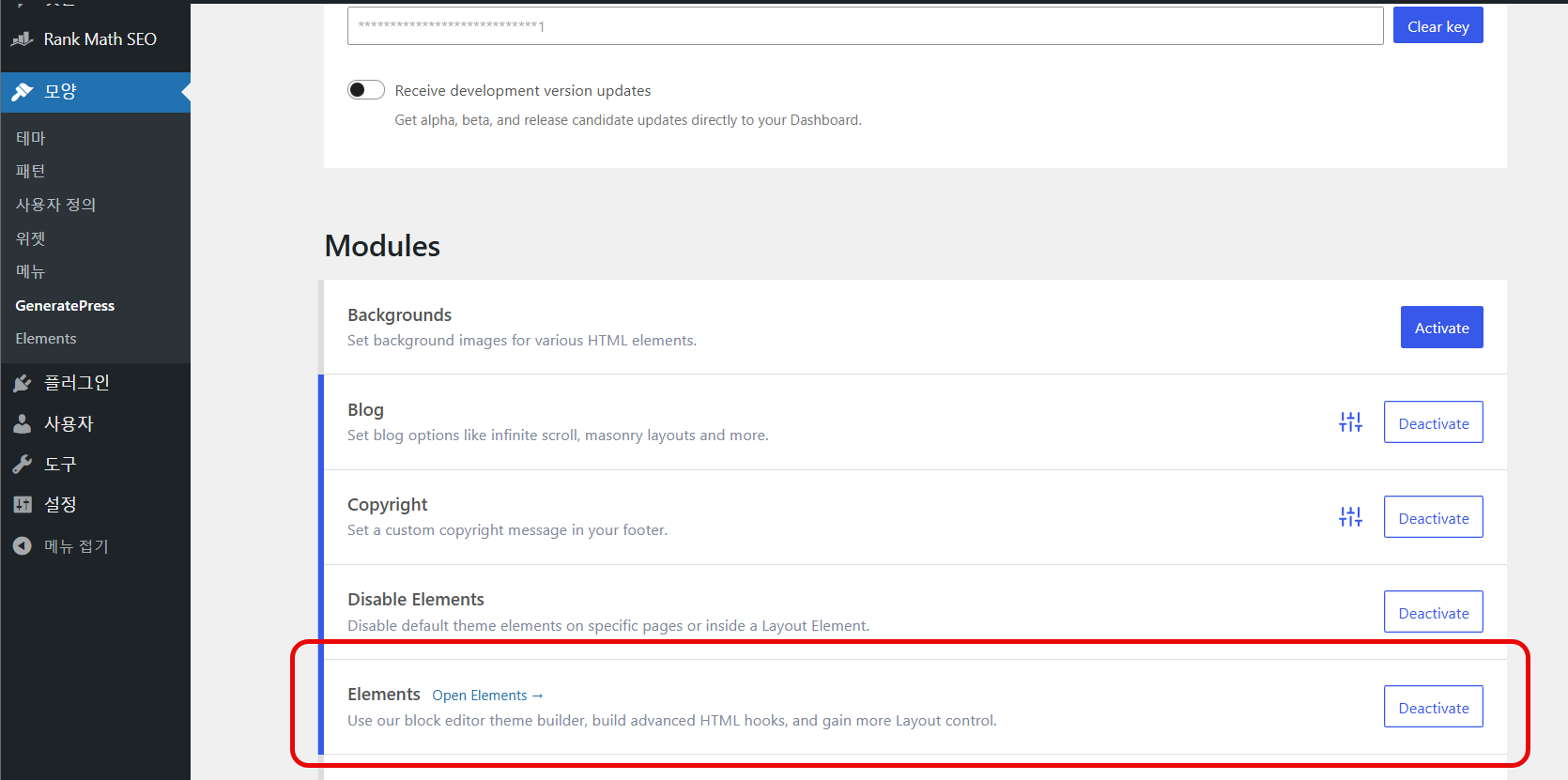 워드프레스 관리자 페이지 » 모양 » GeneratePress » Modules에서 Elements 모듈을 활성화할 수 있습니다.