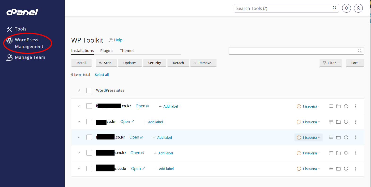 여러 개의 워드프레스 사이트를 운영하는 경우 cPanel의 WordPress Management 툴에서 사이트를 관리하는 것이 효과적일 수 있습니다.