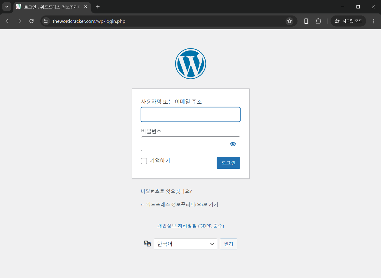 워드프레스 로그인 페이지에서 관리자 아이디와 비밀번호를 입력하여 로그인하기