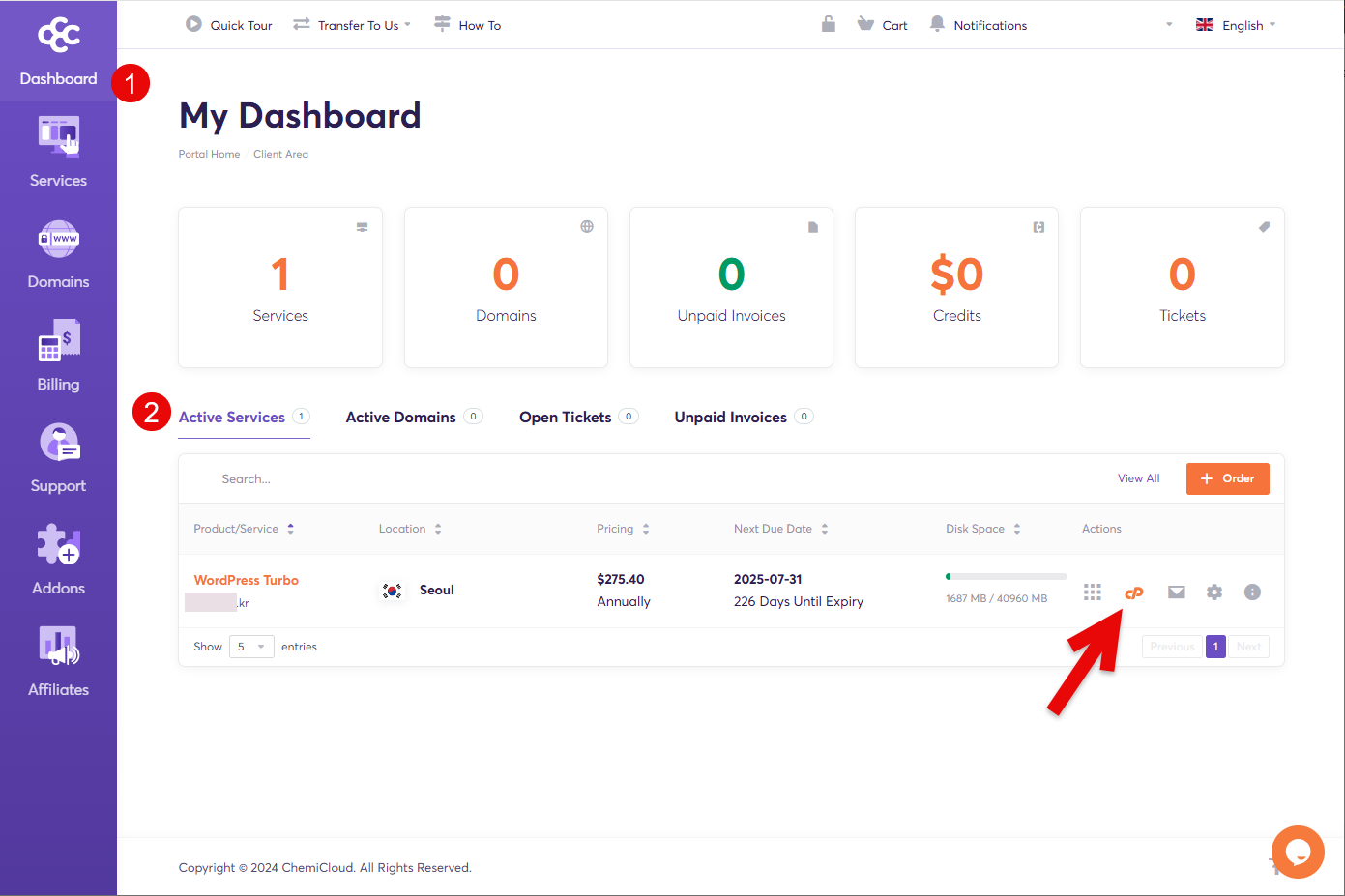 케미클라우드에 로그인한 다음, Dashboard » Active Services로 이동합니다. 이용 중인 서비스의 cPanel 아이콘을 클릭하여 cPanel에 접속합니다.