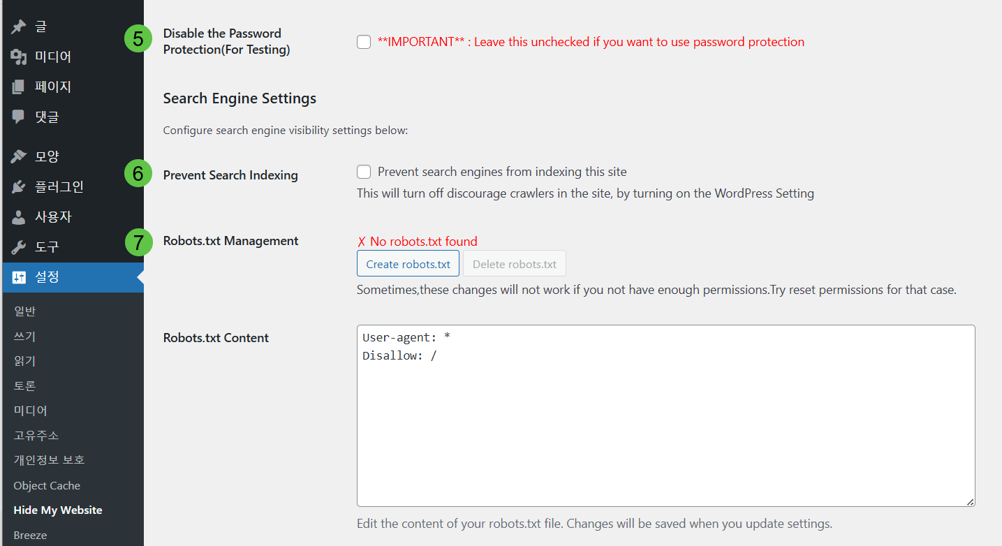 ⑥ Prevent Search Indexing: 검색엔진이 이 사이트를 검색하지 못하도록 설정.