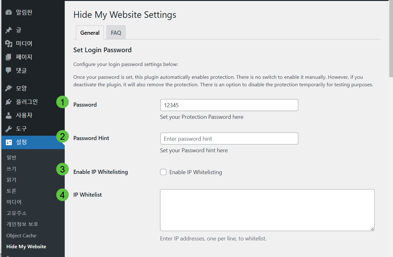 플러그인을 설치하고 활성화하였다면 설정 » Hide My Website로 이동하여 플러그인 세팅을 할 수 있습니다.
