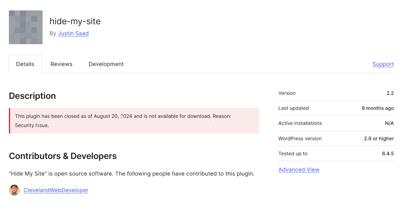 워드프레스 사이트에 접속하려면 비밀번호를 입력해야 하는 플러그인으로 Hide My Site가 있었습니다. 저는 테스트 사이트에 이 플러그인을 주로 설치했지만 2023년 8월에 보안 문제로 인해 워드프레스 플러그인 저장소에서 제거되었습니다.😥