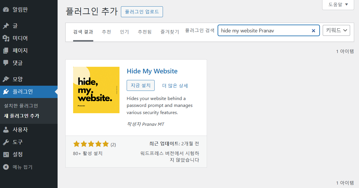 워드프레스 알림판에서 플러그인 » 새 플러그인 추가로 이동하여 hide my website로 검색하여 이 플러그인을 설치할 수 있습니다.