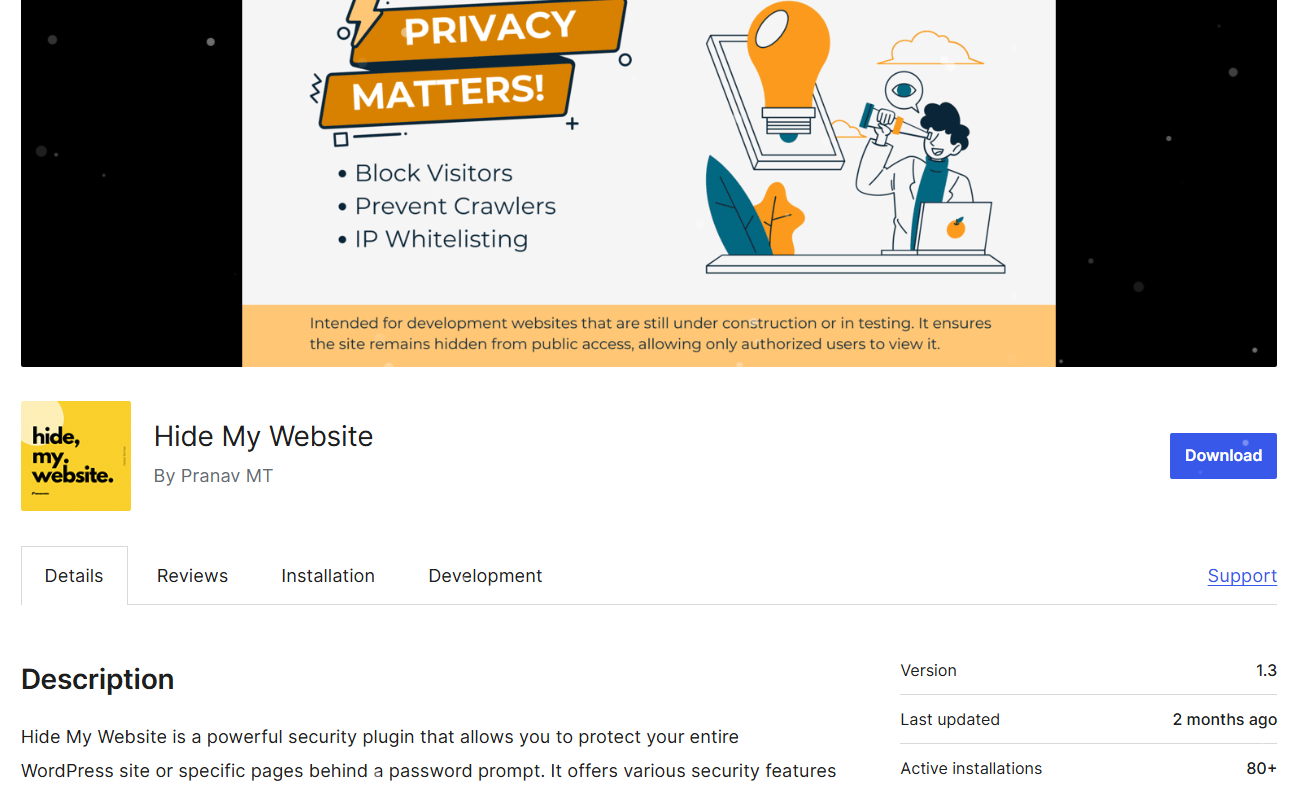 Hide My Site의 대안으로 Hide My Website 플러그인이 있습니다.