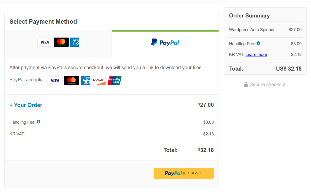 Codecanyon 마켓에서 판매되는 플러그인은 1라이선스 1사이트용으로 이용이 가능합니다. 엔바토 마켓에서 워드프레스 테마나 플러그인을 구입하는 경우 우리나라 사용자에게는 부가세(VAT)가 추가됩니다. 그리고 저는 페이팔로 결제하는 편인데, 페이팔로 결제할 경우 취급 수수료(Handling Fee)가 추가됩니다.