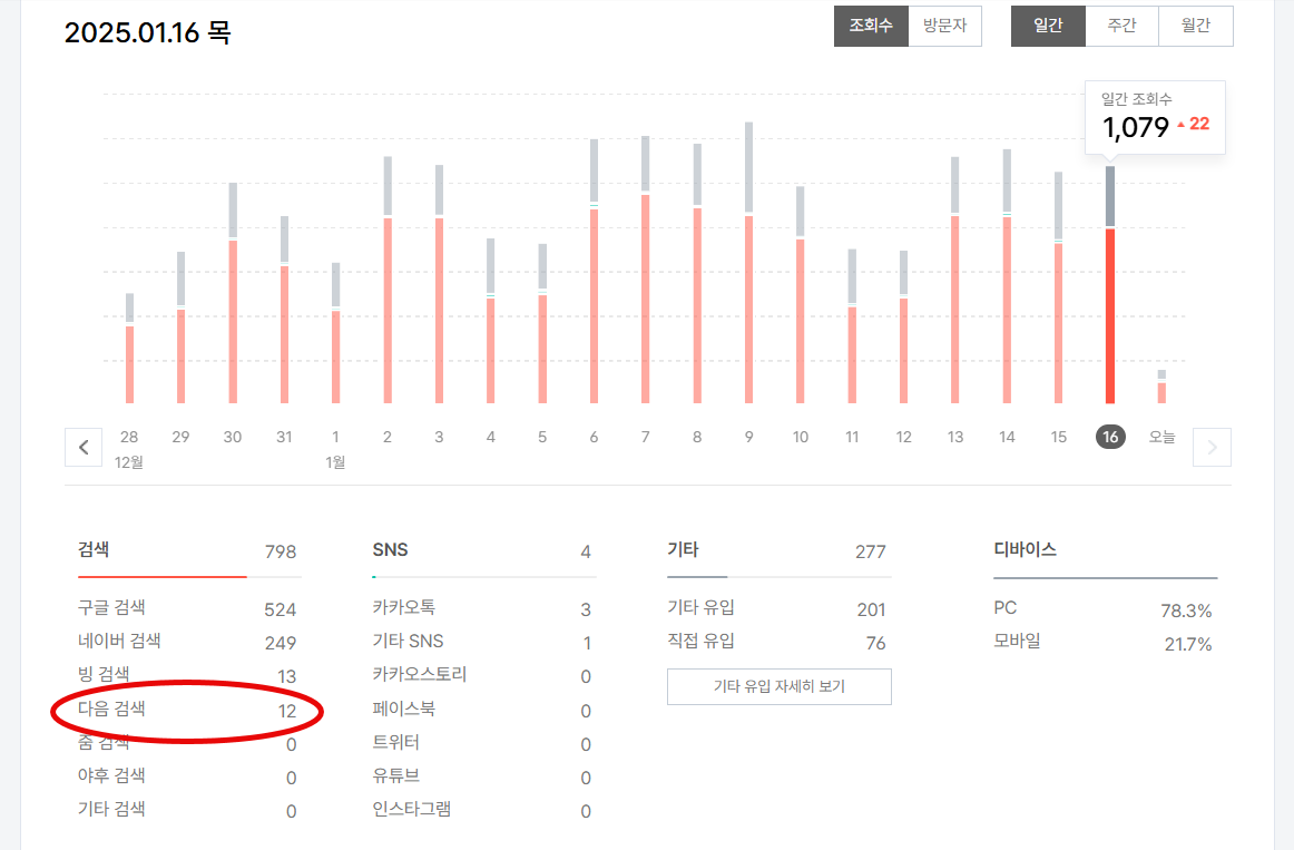 티스토리는 다음 검색엔진에 잘 노출되는 것으로 알려져 있지만 이 블로그는 구글과 네이버에서의 유입에 비해 다음 검색엔진 유입은 사실상 제로(0)에 가깝네요.