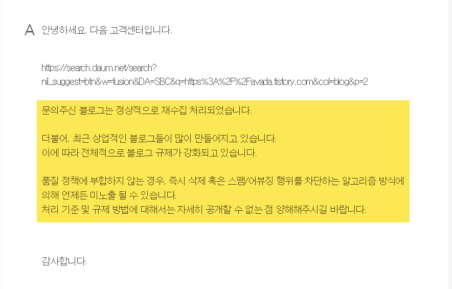 티스토리 블로그 저품질: 다음 고객센터의 답변은?