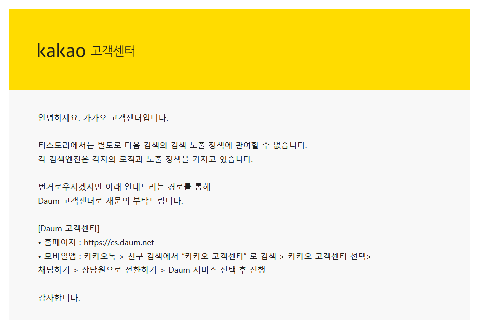 지난주 금요일에 카카오 고객센터에 저품질 문제에 대하여 문의했습니다. 카카오 고객센터에서는 다음 검색의 검색 노출 정책에 관여할 수 없기 때문에 다음 고객센터로 재문의할 것을 안내해 주었습니다.