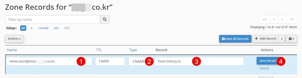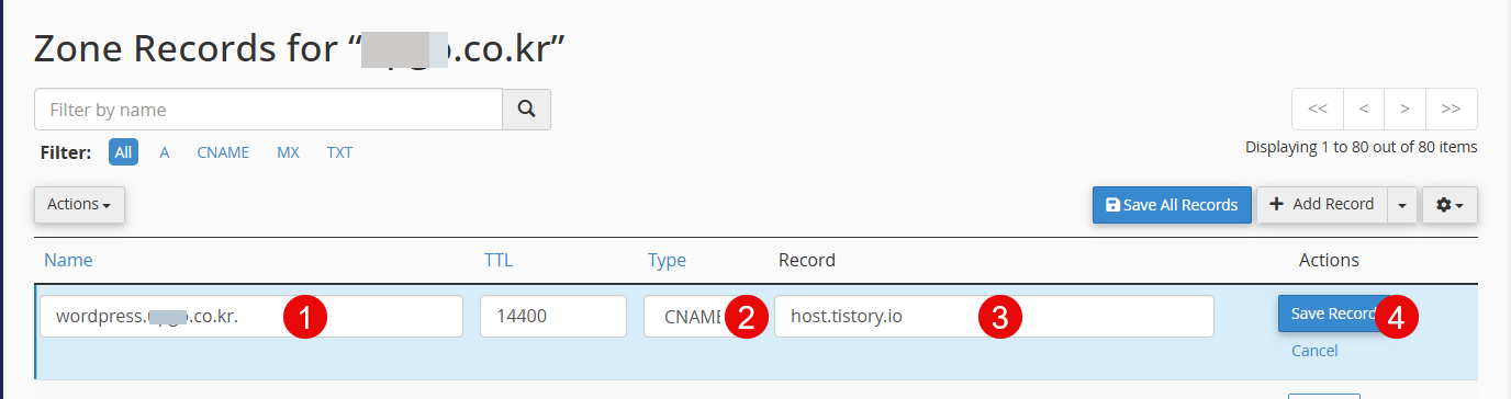 4. 예를 들어, wordpress.example.co.kr 도메인을 추가한다고 하면 다음과 같이 정보를 입력합니다.