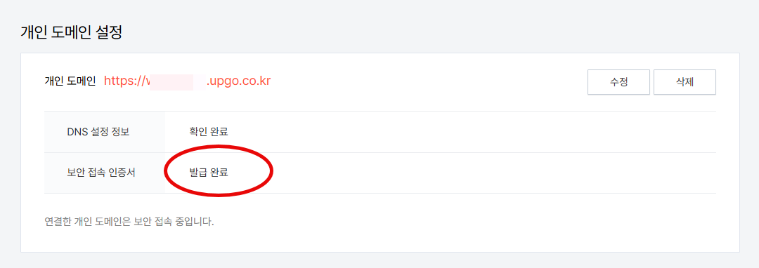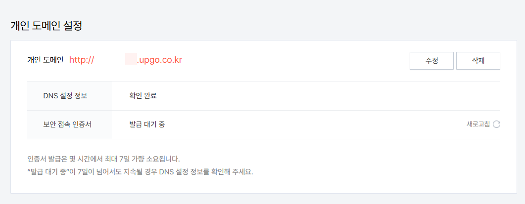 8. DNS 설정이 제대로 지정되었고 서너 시간이 지나면 DNS 설정 정보가 "확인 완료"로 표시될 것입니다. 보안 접속 인증서는 "발급 대기 중"으로 표시될 수 있습니다.