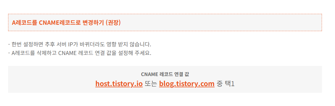 - CNAME 레코드: host.tistory.io 또는 blog.tistory.com 중 택1