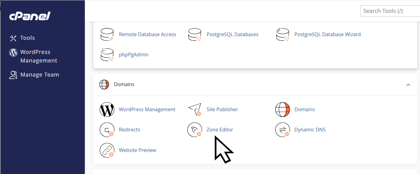 1. 먼저 패스트코멧이나 케미클라우드에 로그인한 다음, cPanel에 접속합니다. cPanel에서 Domains » Zone Editor를 클릭합니다.
