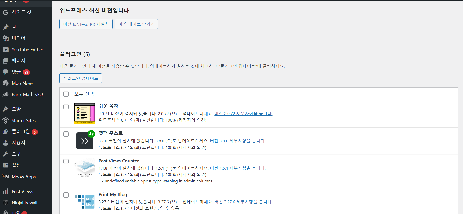 사이트를 살펴보니 최신 버전이 아닌 테마와 플러그인들이 제법 있었지만 비교적 최근까지 업데이트를 하다가 지금은 업데이트를 하지 않고 있는 상황인 것 같았습니다. 이런 경우 최신 버전과 버전 차이가 많이 나지 않기 때문에 최신 버전으로 업데이트해도 사이트에 문제가 발생할 가능성은 낮습니다. (버전 차이가 큰 경우에는 최신 버전으로 업데이트한 후에 에러가 발생할 가능성이 높습니다.)
