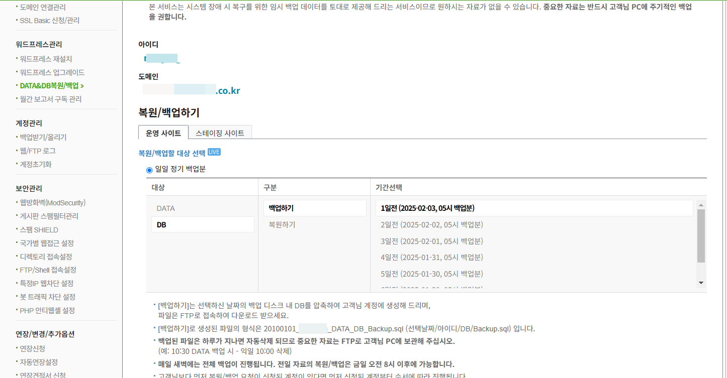 DB는 카페24에서 제공하는 자동 백업 기능을 사용하여 데이터베이스만 백업했습니다.