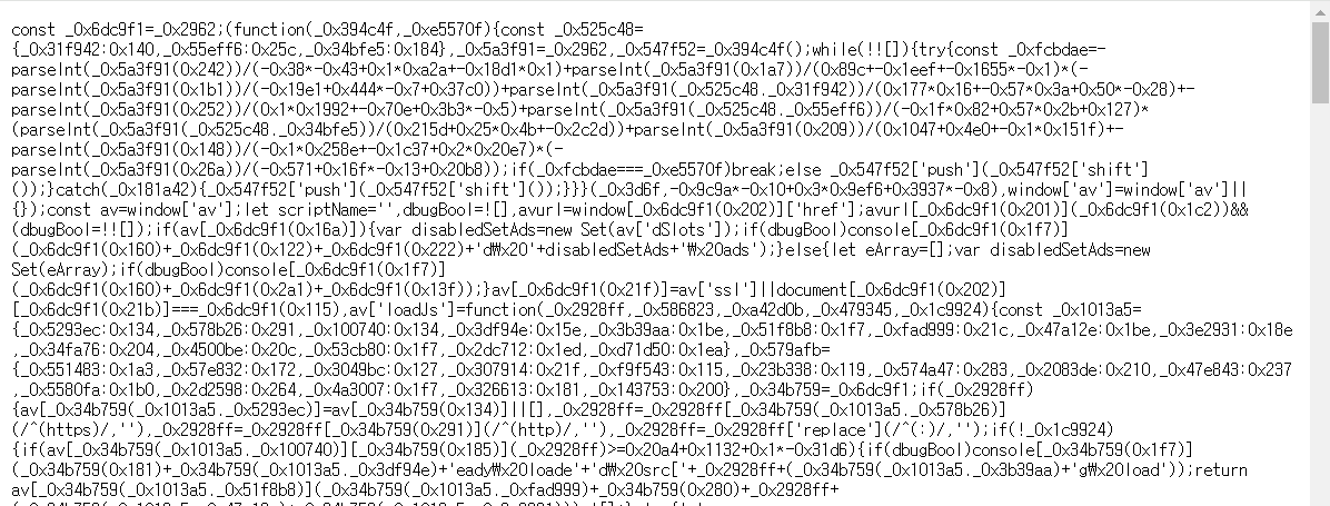 외부 JS 파일을 살펴보니 아래와 같이 난독화되어 이해가 쉽지 않게 되어 있었습니다.