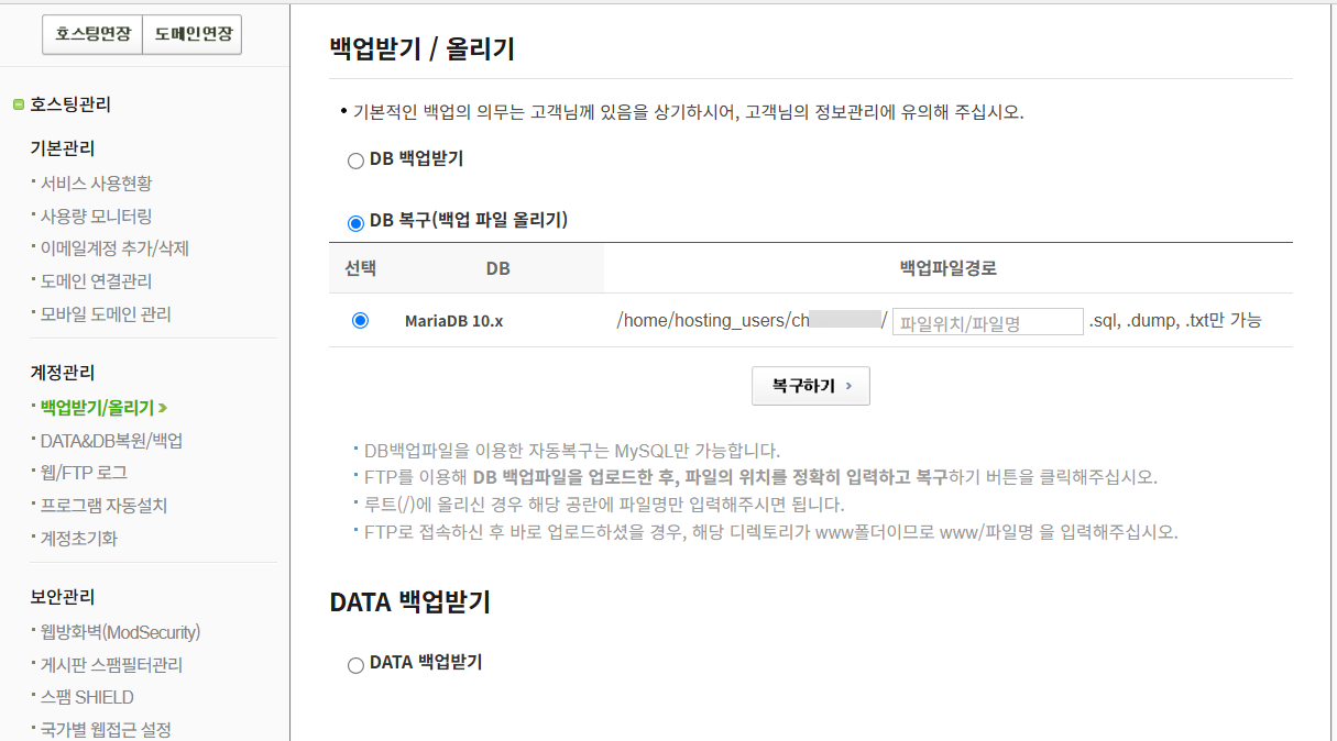 디비의 경우 FTP를 통해 DB 파일을 업로드한 후에 계정관리 » 백업받기/올리기로 이동하도록 합니다. DB 복구(백업 파일 올리기)를 선택하여 백업 파일 경로를 입력하고 복구하기 버튼을 누르면 복구가 됩니다.