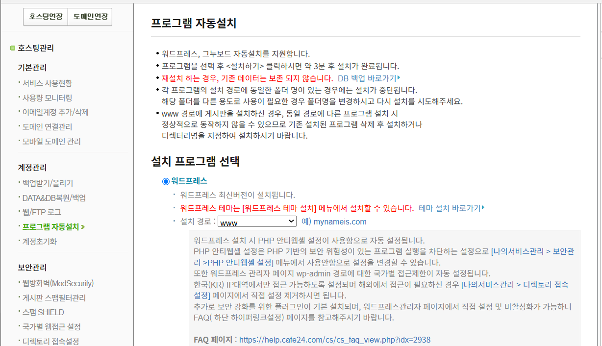 워드프레스나 그누보드를 운영하려는 경우 계정관리 » 프로그램 자동설치로 이동하여 워드프레스나 그누보드를 선택합니다.