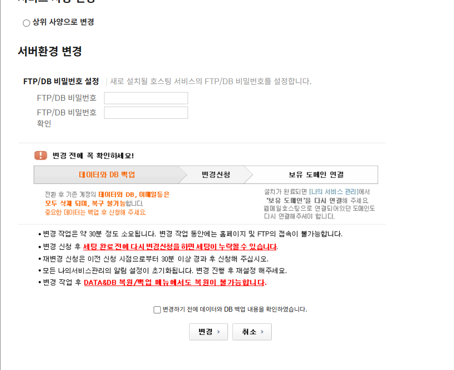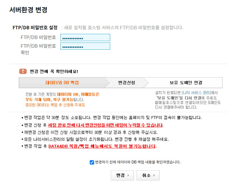 FTP/DB 비밀번호를 지정하고 데이터/DB를 백업하여 PC에 보관한 다음, 변경하기 전에 데이터와 DB 백업 내용을 확인하였습니다. 체크란을 체크한 후에 변경 버튼을 누릅니다.