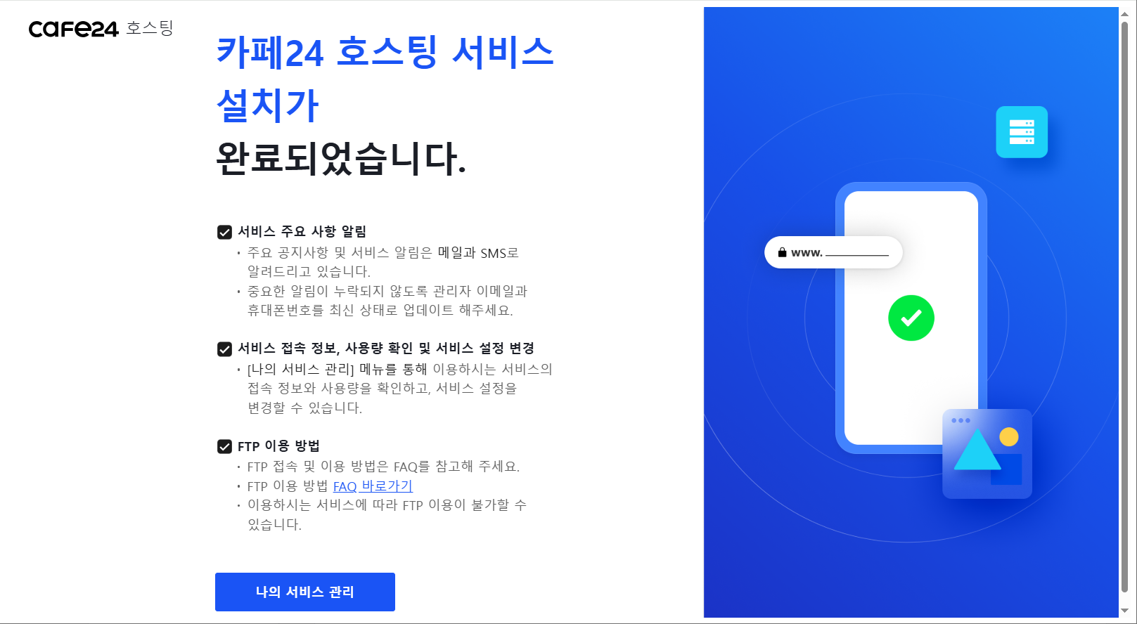 세팅이 완료되면 사이트에 접속 시 아래와 같이 "카페24 호스팅 서비스 설치가 완료되었습니다" 화면이 표시됩니다.