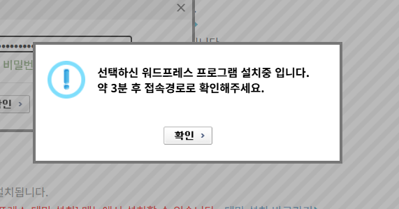 선택한 워드프레스 프로그램이 설치 중이라는 문구와 함께 약 3분 후에 접속 경로로 확인하라는 팝업 메시지가 표시됩니다.