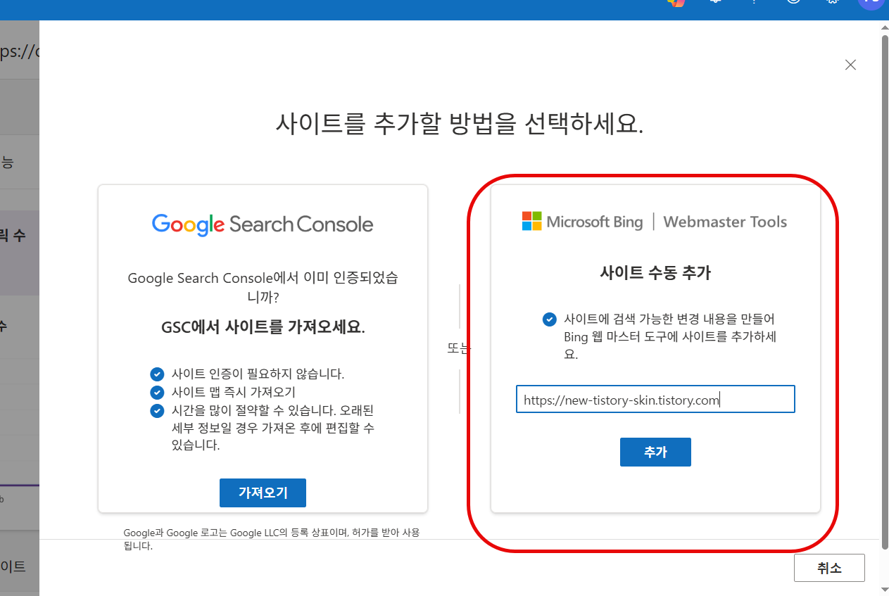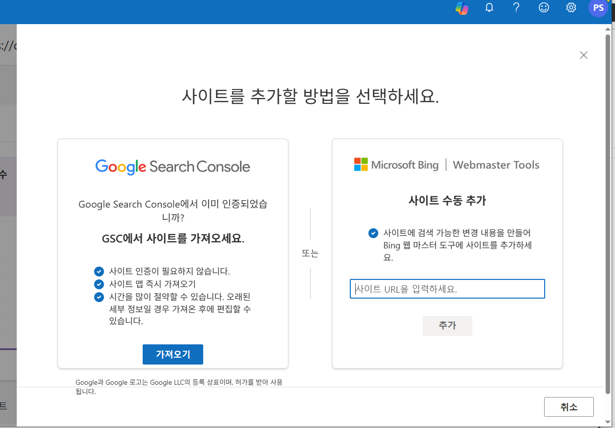Bing 웹마스터 도구에도 비슷한 방법으로 가능합니다. 빙 웹마스터 도구의 경우 구글 계정과 연동하여 구글 서치 콘솔에 등록한 사이트를 가져오거나 직접 사이트를 추가할 수 있습니다.