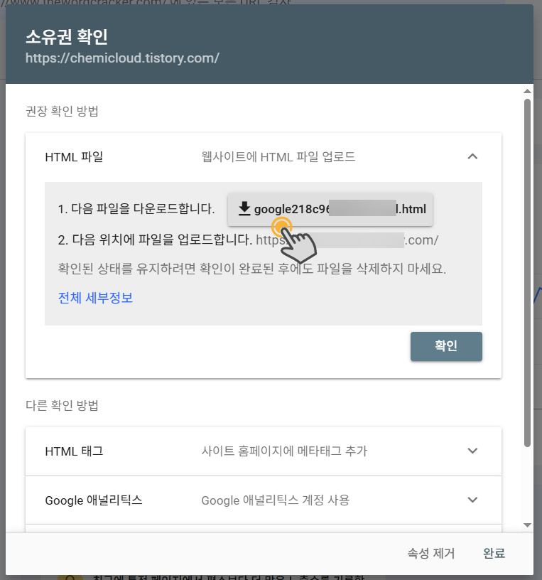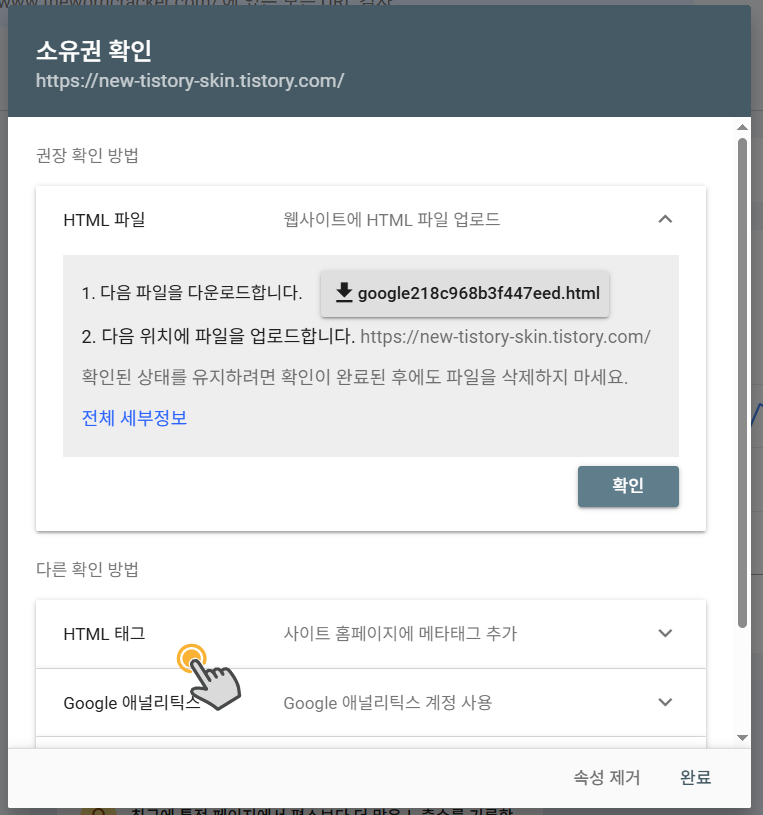 소유권 확인 팝업이 표시되면 HTML 태그를 클릭합니다. HTML 파일 방식은 티스토리에서 지원되지 않습니다. 워드프레스를 운영하는 경우에는 HTML 파일에서 HTML 파일을 다운로드하여 FTP로 사이트의 루트 폴더로 업로드하면 됩니다.