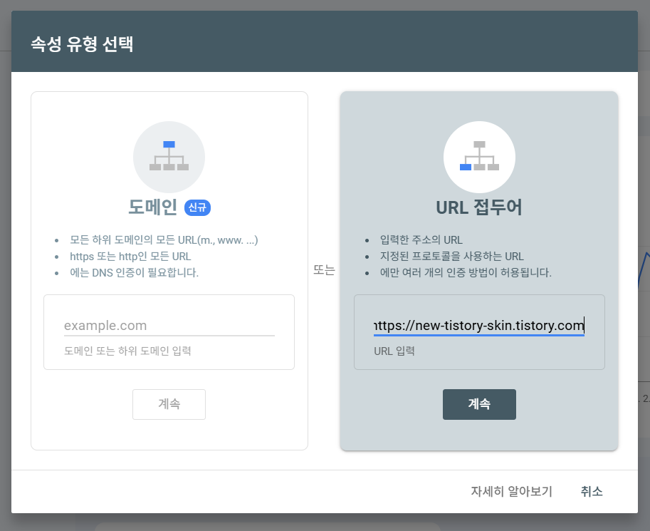[참고*개인 도메인을 연결한 경우에는 도메인 속성과 URL 접두어 속성을 모두 추가할 수 있습니다. 우선 이 글의 방법에 따라 URL 접두어 속성으로 추가하도록 합니다. 도메인 속성도 추가하고 싶은 경우 이 글을 참고하여 추가하시기 바랍니다. 두 속성은 약간의 차이가 있고, 두 속성을 모두 추가해도 됩니다.*]