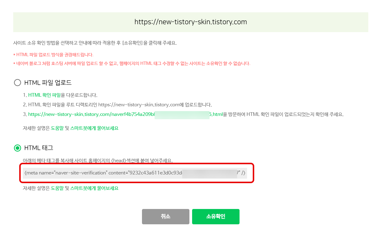 HTML 탭에서 <head>와 </head> 사이에 사이트 소유 태그를 추가하면 됩니다.