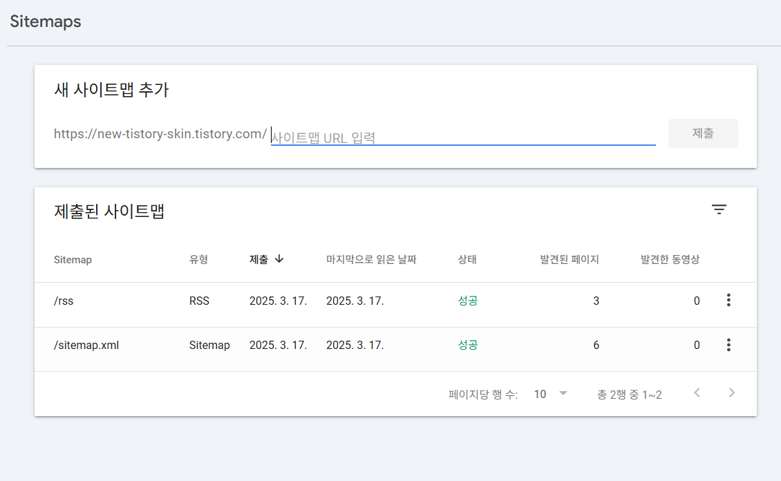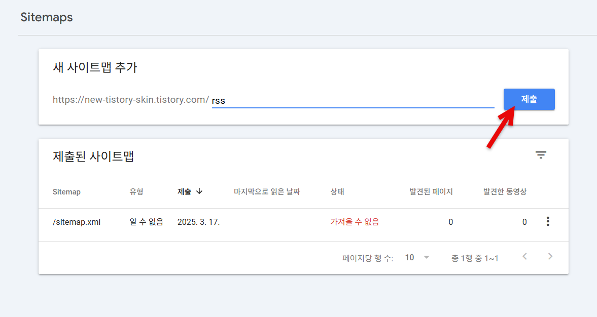 티스토리의 사이트맵 주소는 /sitemap.xml입니다. 제출 직후에는 "가져올 수 없음" 오류가 상태 컬럼에 표시될 수 있습니다. 시간이 지나면 성공으로 바뀌므로 무시합니다.
