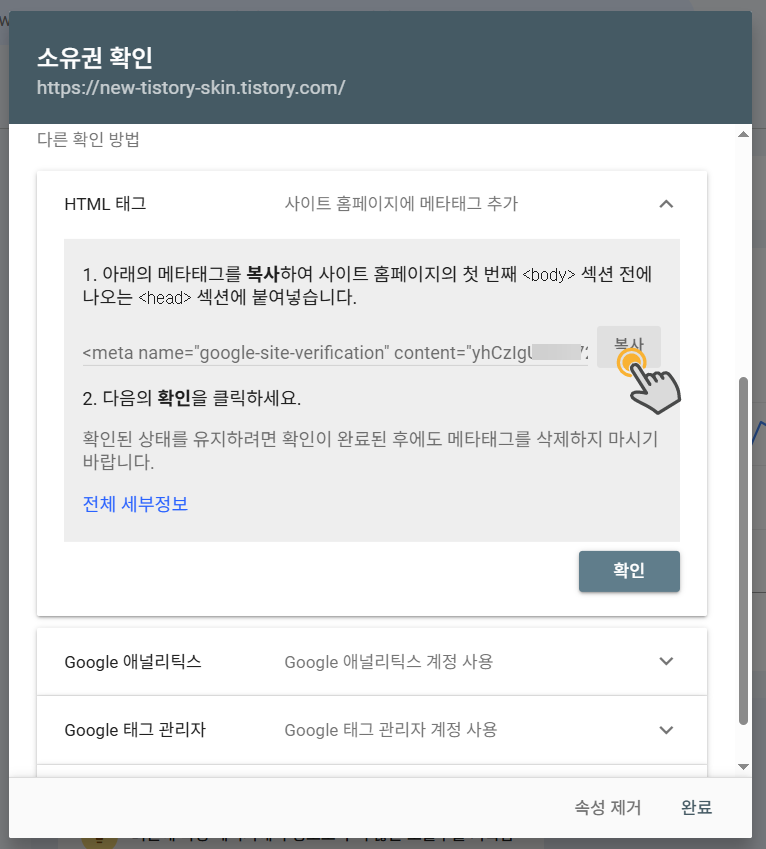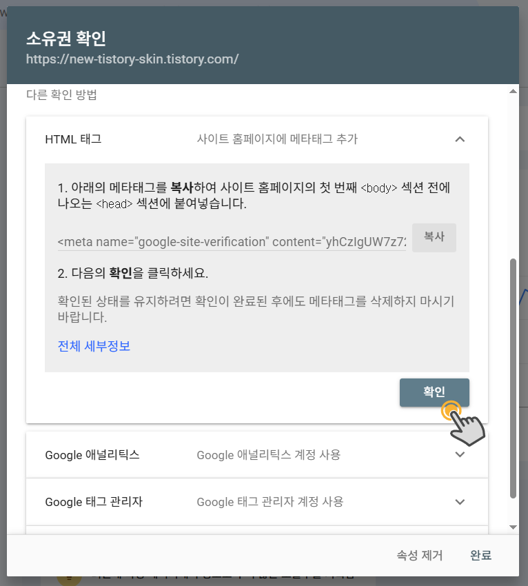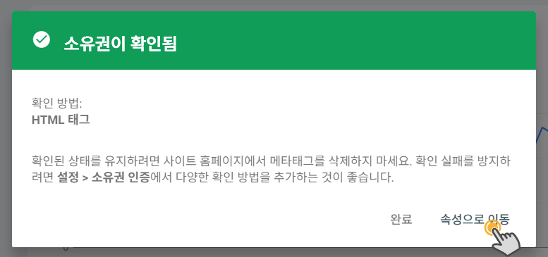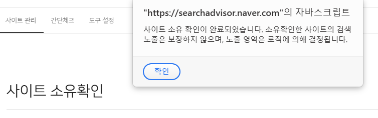 소유 확인 HTML 태그를 제대로 입력했다면 사이트 소유 확인이 완료되었습니다 팝업이 표시됩니다.