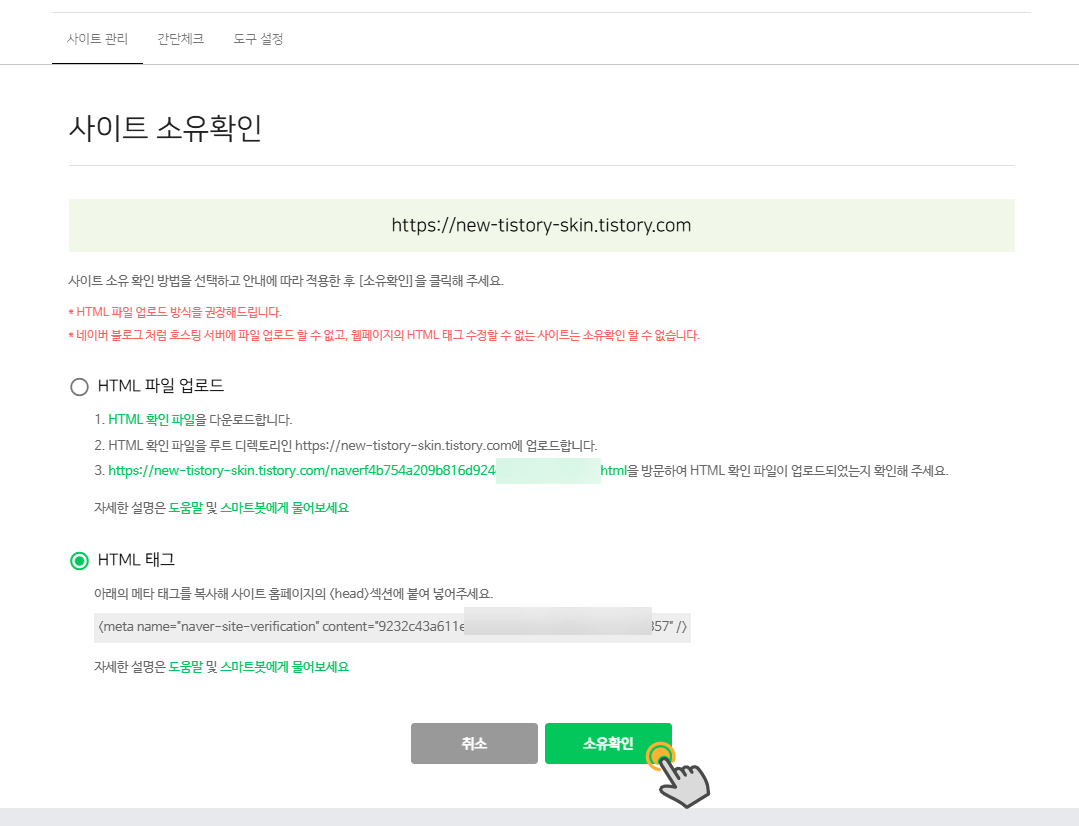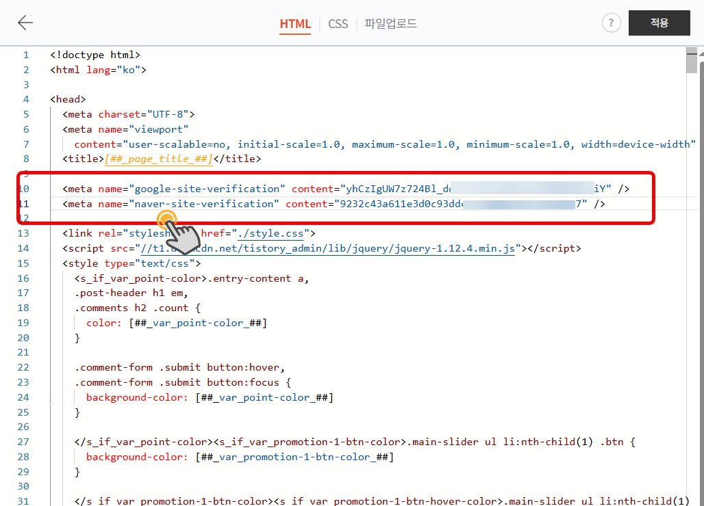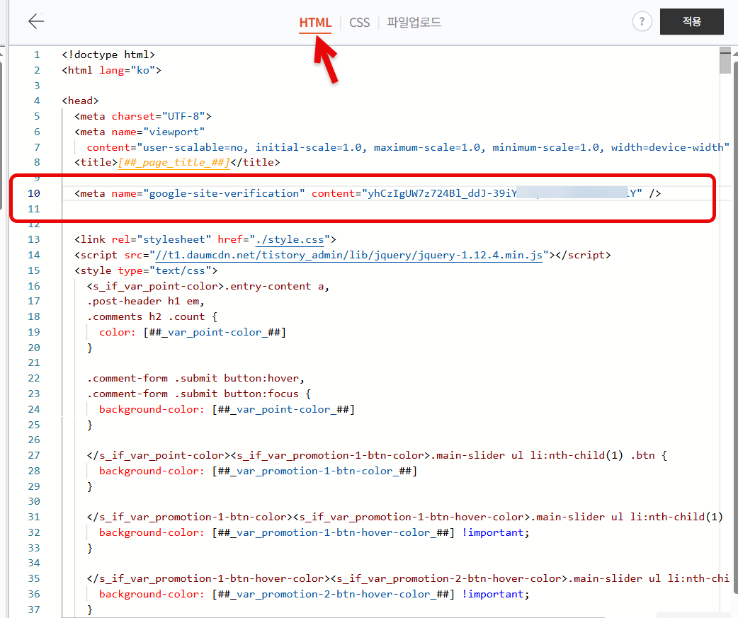 티스토리 스킨에 사이트 확인 HTML 태그 붙여넣기