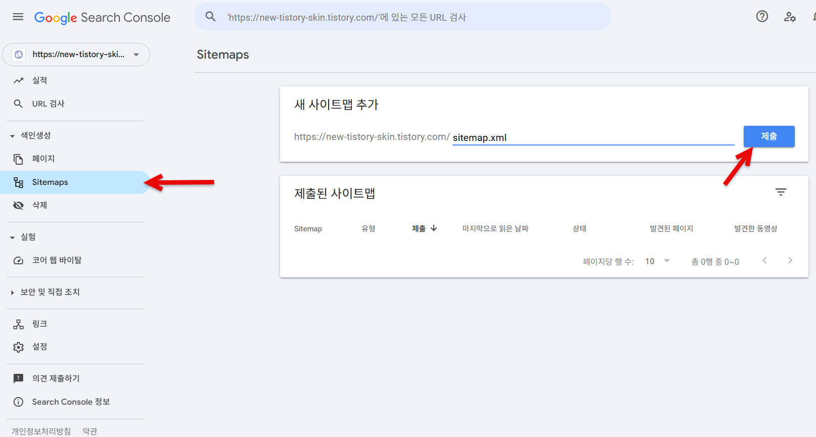 Google Search Console의 Sitemaps 메뉴에서 새 사이트맵을 추가하여 제출합니다.