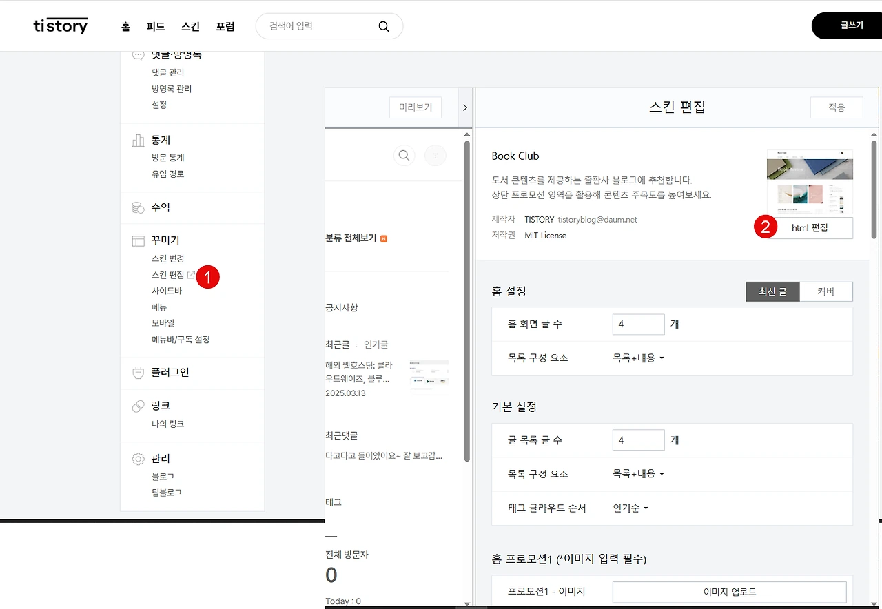 이제 티스토리에 로그인하여 꾸미기 » 스킨 편집 » html 편집을 클릭하여 스킨 편집 화면으로 이동합니다.
