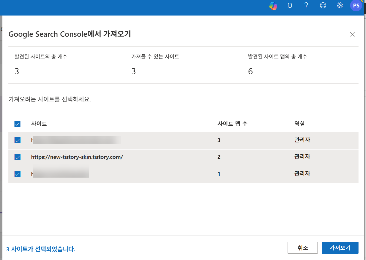 계속을 누르고 구글 계정을 선택하면 구글 서치 콘솔에 등록된 사이트 중에서 가져오지 않은 사이트 목록이 제시됩니다.