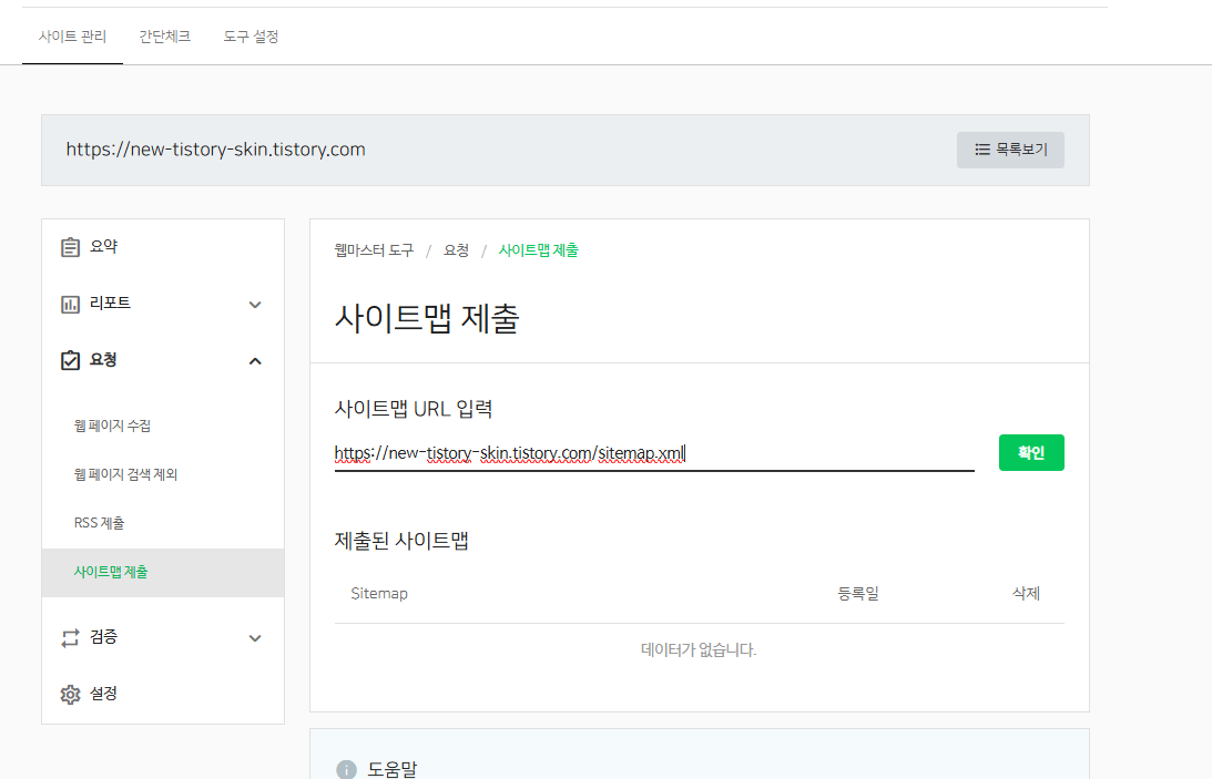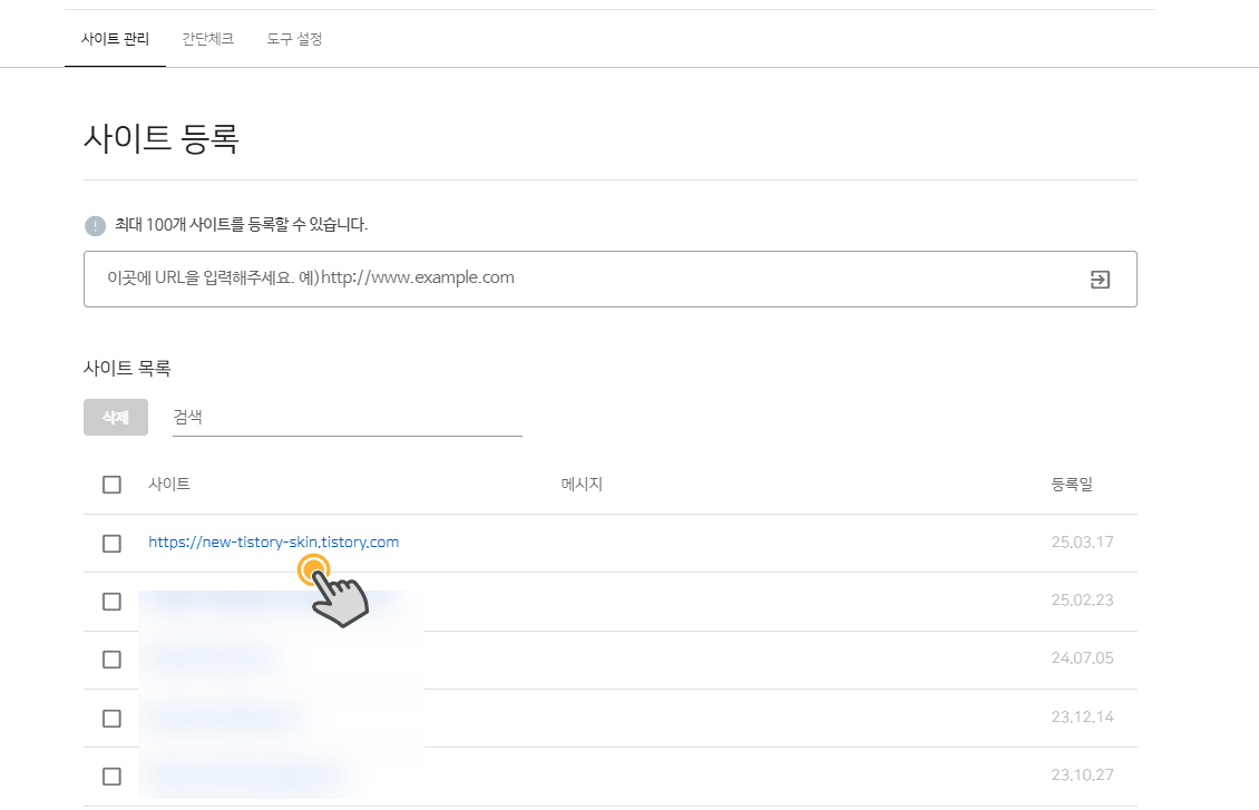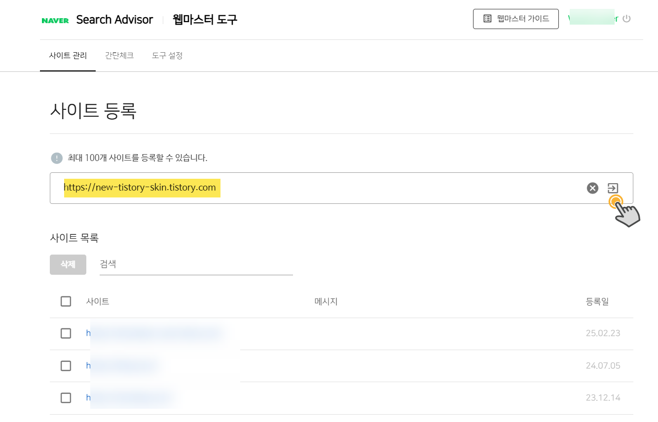 티스토리 사이트 주소를 입력하고 맨 오른쪽의 아이콘을 클릭합니다.