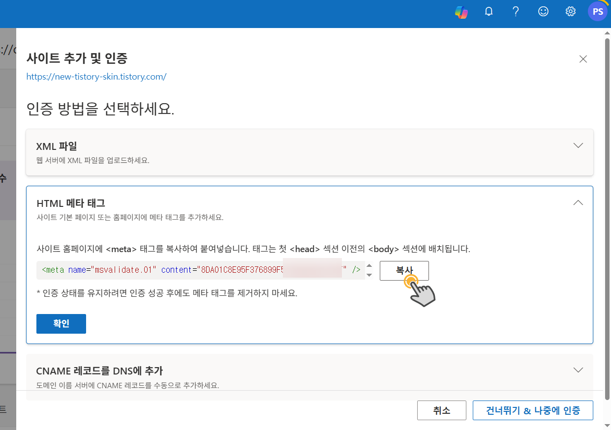 인증 방법을 선택하는 화면이 표시됩니다. 티스토리는 파일 업로드가 불가능하므로 HTML 메타 태그를 선택합니다.