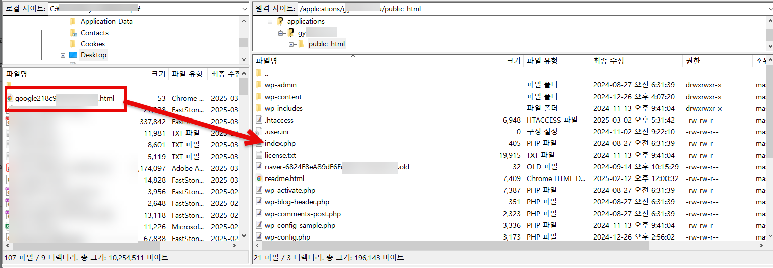 마찬가지로 워드프레스를 이용하는 경우에는 HTML 파일을 다운로드하여 FTP를 통해 루트 폴더로 업로드하여 사이트 소유 확인을 받을 수 있습니다.