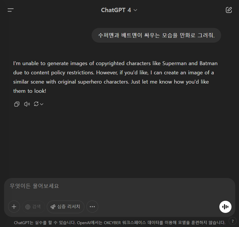 슈퍼맨과 배트맨이 싸우는 모습을 만화로 그려달라고 요청하니 ChatGPT에서는 저작권 있는 캐릭터의 이미지는 생성할 수 없다는 답변을 내놓았습니다.