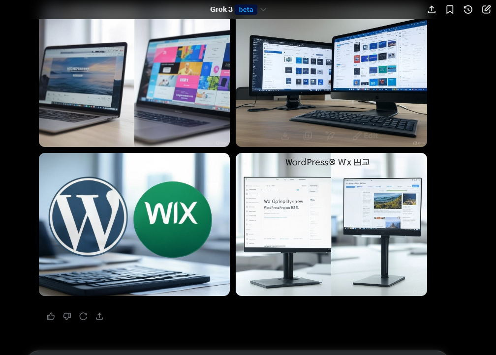 그록 3에서 동일한 프롬프트로 이미지 생성을 요구하니 WordPress와 Wix 로고를 적당히 활용/변형하여 이미지를 만들어주네요.