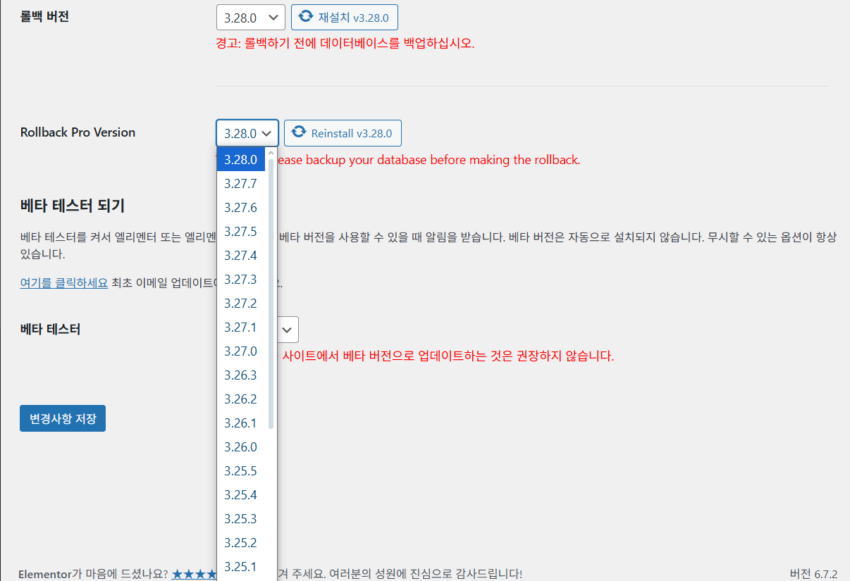 엘리멘터 플러그인: 버전 변경, 롤백 방법